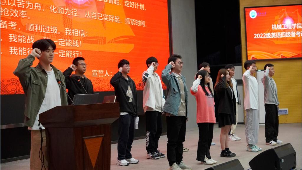 辅导员苏洪业宣读机械公司四级备考方案,主要内容包括加强引导,积极动员,形成上下联动合力;加强督导,压实责任,营造良性互动机制;加强帮扶,精准施策,提高四级学习效果;加强奖励,激发动力,突破绩效考核目标;加强协作,稳步推进,保障圆满完成备考。希望全体同学们在接下来的备考时间内,全力以赴,公司也全力支持,提高同学们英语四级通过率。
