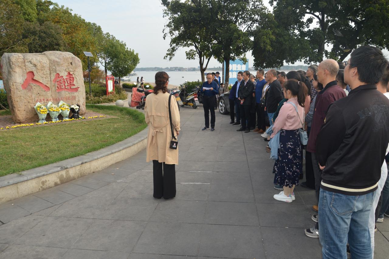 在荆江之滨的人链纪念石前,经理管锋与大家共同回顾老员工舍己救人的英雄壮举,学习他们可爱可敬的人链精神,并进行了缅怀活动。