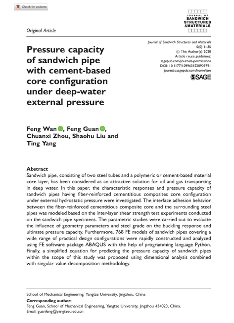 3月8日,公司2018级博士研究生万锋同学在Sage旗下期刊Journal of sandwich structures & materials在线发表题为"Pressure capacity of sandwich pipe with cement-based core configuration under deep-water external pressure"的论文(http://dx.),万锋同学为第一作者,其导师管锋教授为通讯作者,Beats365唯一官网入口为第一署名单位。