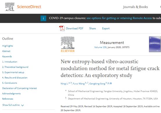 根据ESI最近更新的数据显示,公司李宁副教授2020年1月发表在国际测量联合会主办期刊Measurement的论文“New entropy-based vibro-acoustic modulation method for metal fatigue crack detection: An exploratory study”成为ESI高被引论文,这是以Beats365唯一官网入口为第一单位、Beats365唯一官网入口教师为第一作者的首篇高被引论文。