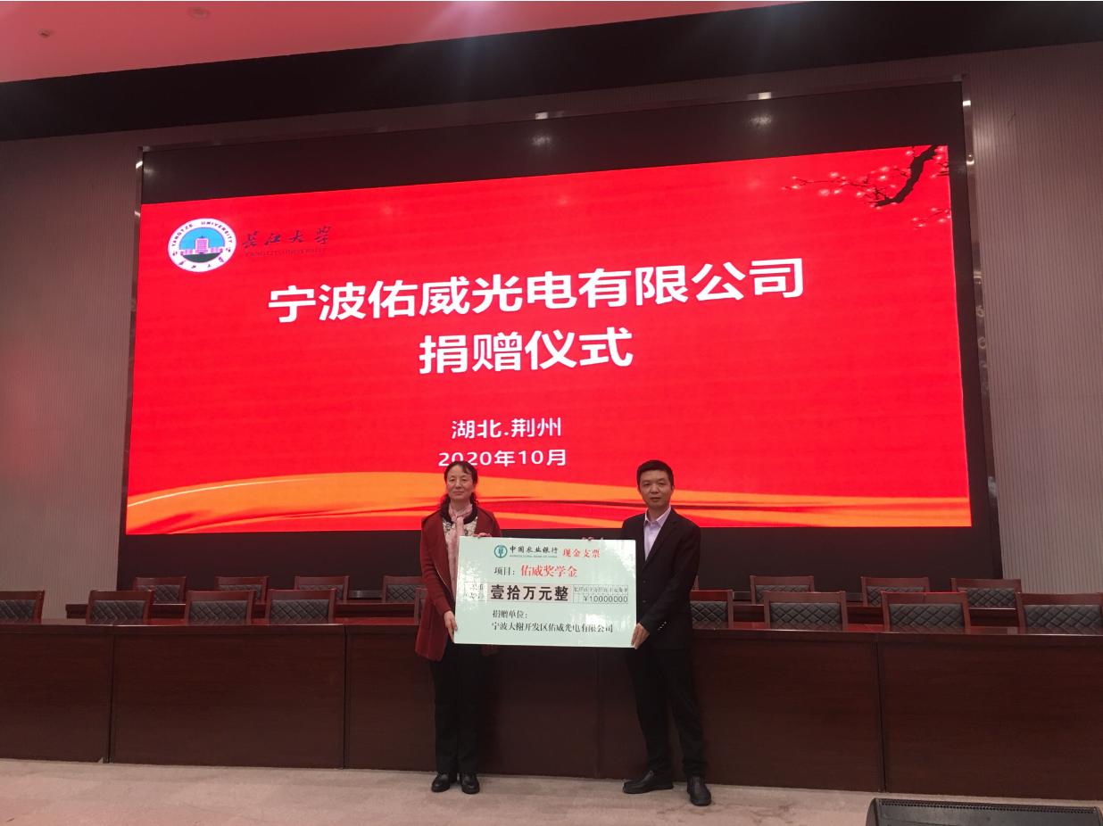 在佑威奖学金捐赠仪式中,党委书记王红艳代表公司接受宁波佑威光电有限公司捐款10万元。