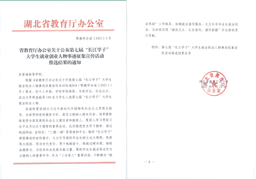 日前,由湖北省教育厅主办的第七届“长江学子”老员工就业创业人物事迹征集活动评选结果揭晓,2名员工当选,Beats365唯一官网入口硕士研究生何宇航入选开拓创新类。