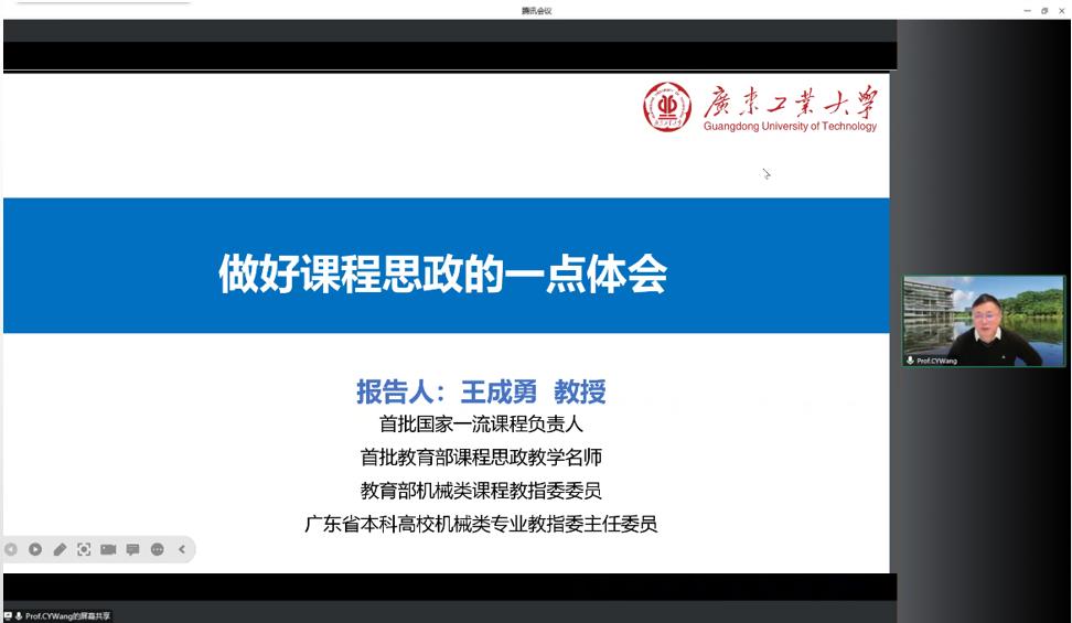 王成勇教授表示课程思政建设是落实立德树人根本任务的战略举措。他首先强调要通过课程思政来坚定员工的理想信念,引导员工深入了解世情国情党情民情,帮助当代老员工建立正确的世界观、人生观、价值观。随后他围绕课程思政的基本概念、课程思政的任务、机械专业课程思政教学设计与评价、广东工业大学《机械制造基础》课程思政的教学实践等方面开展报告。王成勇教授指出要把思政元素融于专业知识中,而非生硬嵌入。同时要结合专业自身历史和专业学科前沿,讲好“思政故事”,提高课程思政教学的生动性和有效性。