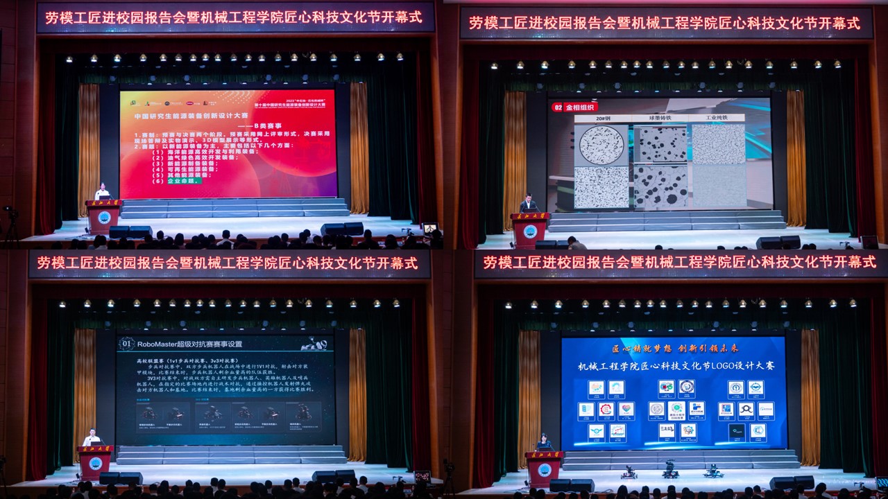 活动第二部分:机械学子2023年创新实践成果汇报。荣获中国研究生能源装备创新设计大赛国赛一等奖、全国老员工金相技能大赛一等奖、RoboMaster超级对抗赛全国二等奖的获奖团队代表依次上台分享他们的创新实践故事并向现场同学们发出新一轮的参赛邀请。