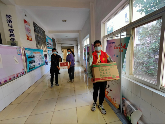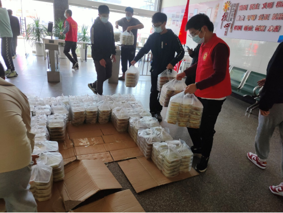 “这两天除了累没有别的感觉,回到寝室一般都是倒头就睡。”党员志愿服务小组每天主要工作之一就是早起协助医护人员进行核酸检测,为了保障核酸检测顺利进行,每天天刚亮就起床,穿好志愿者服下楼维持秩序,接应医护人员。而最辛苦的工作,就是负责整栋楼将近1000人的餐食发放工作,餐食的分装、搬运都是由他们来做。