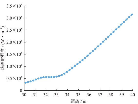 图1 喷淋作用下放喷热辐射强度计算示意图 图2 中轴线30~40 m热辐射强度曲线图