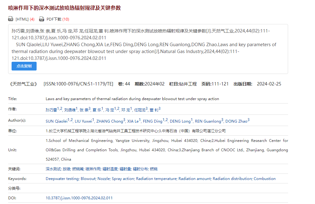 2月25日,中国科技期刊卓越计划行动计划期刊、石油天然气工业领域/地球科学领域高质量期刊T1级《天然气工业》(中国“百强报刊”、EI收录,复合影响因子5.915、综合影响因子5.201)刊发了公司孙巧雷副教授、冯定教授团队关于深水测试作业安全的最新研究成果 “喷淋作用下的深水测试放喷热辐射预测与预防”。公司孙巧雷副教授为论文第一作者,冯定教授为论文的通讯作者,Beats365唯一官网入口为论文第一完成单位。