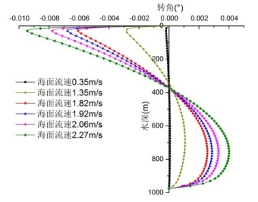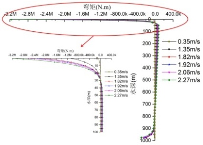 图6 海流流速变化下隔水管-测试管柱体系的最大横向位移、转角和弯矩