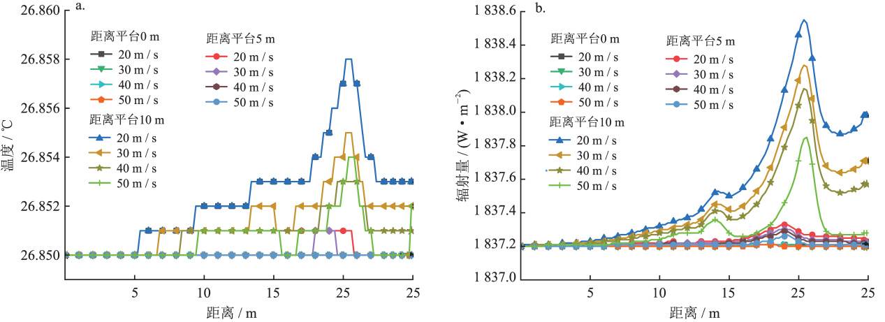 图5 不同喷射速度近平台区域温度与辐射量分布图