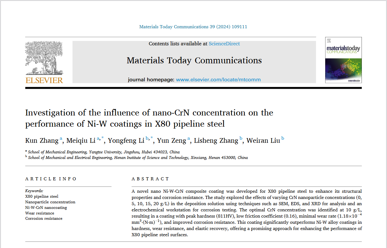 2024年6月,由Elsevier主办的权威外文T1级学术期刊Surface and Coatings Technology、T2级学术期刊Colloids and Surfaces A: Physicochemical and Engineering Aspects、T3级学术期刊Materials Today Communications先后刊发了公司李美求教授团队关于油气管道X80管线钢表面涂层的最新研究成果,公司博士研究生张昆为论文第一作者,李美求教授为论文的通讯作者。