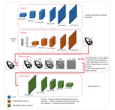 拓扑优化是一种用于优化材料分布、提升结构性能的设计方法,广泛应用于航空和石油设备等领域。传统方法计算量大、耗时长,难以满足复杂结构的实时需求。为解决这一问题,该研究提出了两种基于生成对抗网络的方法:改进的扩散生成对抗网络和多尺度梯度生成对抗网络。通过特征压缩、轻量级残差模块、混合注意力机制及多维融合损失函数,这两种方法显著提升了计算效率和生成质量。扩散生成对抗网络利用高斯噪声扩散增强泛化能力,多尺度梯度生成对抗网络精确提取显著特征,并通过低分辨率到高分辨率的参数迁移实现了高质量训练。实验表明,相较传统方法,这些方法大幅提升了生成效率,有助于实现实时优化,提供更高效的工程解决方案。