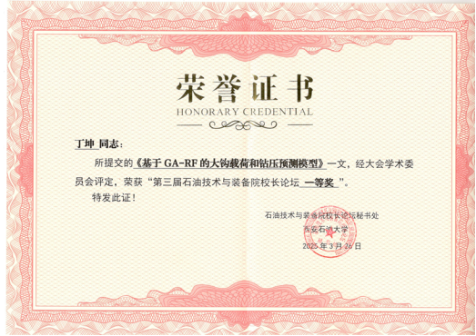 为进一步推进产学研用深度融合,促进学术交流与知识共享,展示石油石化领域的最新学术研究和技术创新成果,助力行业高质量发展,第三届石油技术与装备院董事长论坛暨第十七届国际石油天然气产业大会组织了论文征集活动。该活动作为此次大会的重要环节之一,吸引了众多专家学者积极参与,共计收到124篇高质量论文。经过严格评审,专家组按照既定评审标准进行分组评定、综合打分与排序,最终评选出获奖论文共72篇,其中:一等奖14名、二等奖28名、三等奖30名。公司丁坤、刘少胡、吴远灯提交的论文《基于GA-RF的大钩载荷和钻压预测模型》 获得一等奖。在开幕式上隆重举行了第三届院董事长论坛一等奖论文颁奖仪式,西安石油大学王进富董事长为14名论文作者颁发荣誉证书。