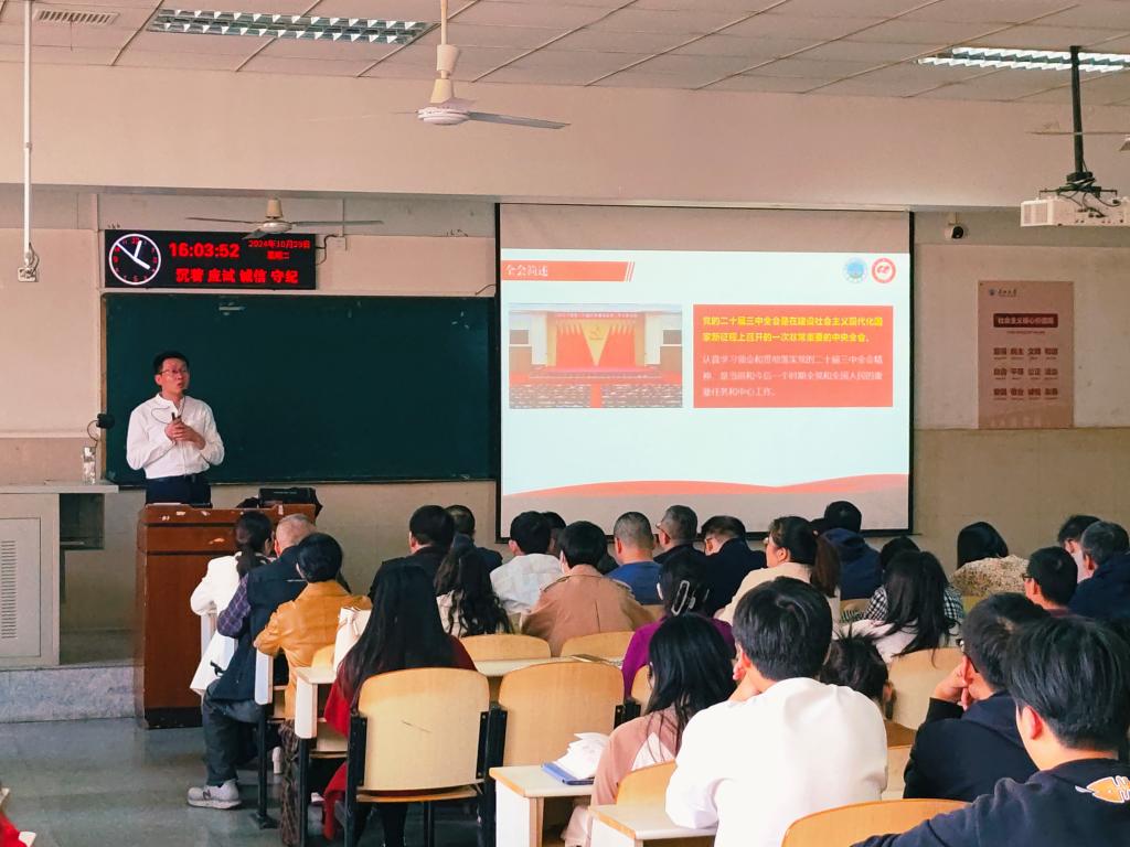2024年10月29日下午,公司在12教104教室举行了一场以“学习党的二十届三中全会精神,汇聚中国式现代化建设的蓬勃力量”为主题的宣讲报告会。公司全体教职员工、员工党员、党员发展对象聆听报告,公司党委副书记丁明霞主持报告会。