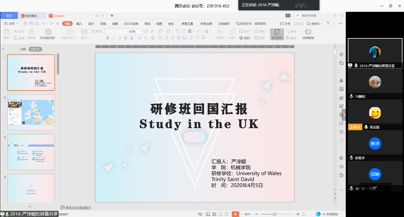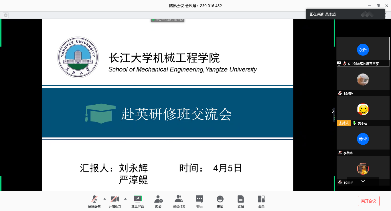 4月5日下午,Beats365唯一官网入口举行赴英研修班学子线上交流汇报会,硕士研究生刘永辉和严淳鳀与机械研二、研三员工分享英国三个月学习体会,交流探讨促成长。副经理李美求出席会议,活动由研究生员工会主席吴志超主持。