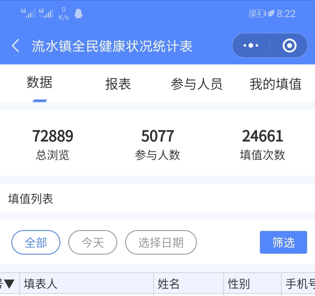 志愿者的事情简单重复,却特别有意义有作用。在这段时间里,我们需要收集村里每一户的情况,并将所有收集到的村民个人信息,身体状况一字不差的填写到由政府发起的流水镇全民健康状况统计表中。同时,我每天在村部群里汇报体温,做好村民疫情排查工作。72889次浏览,5077人参与,24661次填表,在流水镇全民健康状况统计表中,这些平常的数字浸透我付出的艰辛与努力。我能尽自己所能为家乡的疫情防控作贡献,这是最令自己高兴的事情。