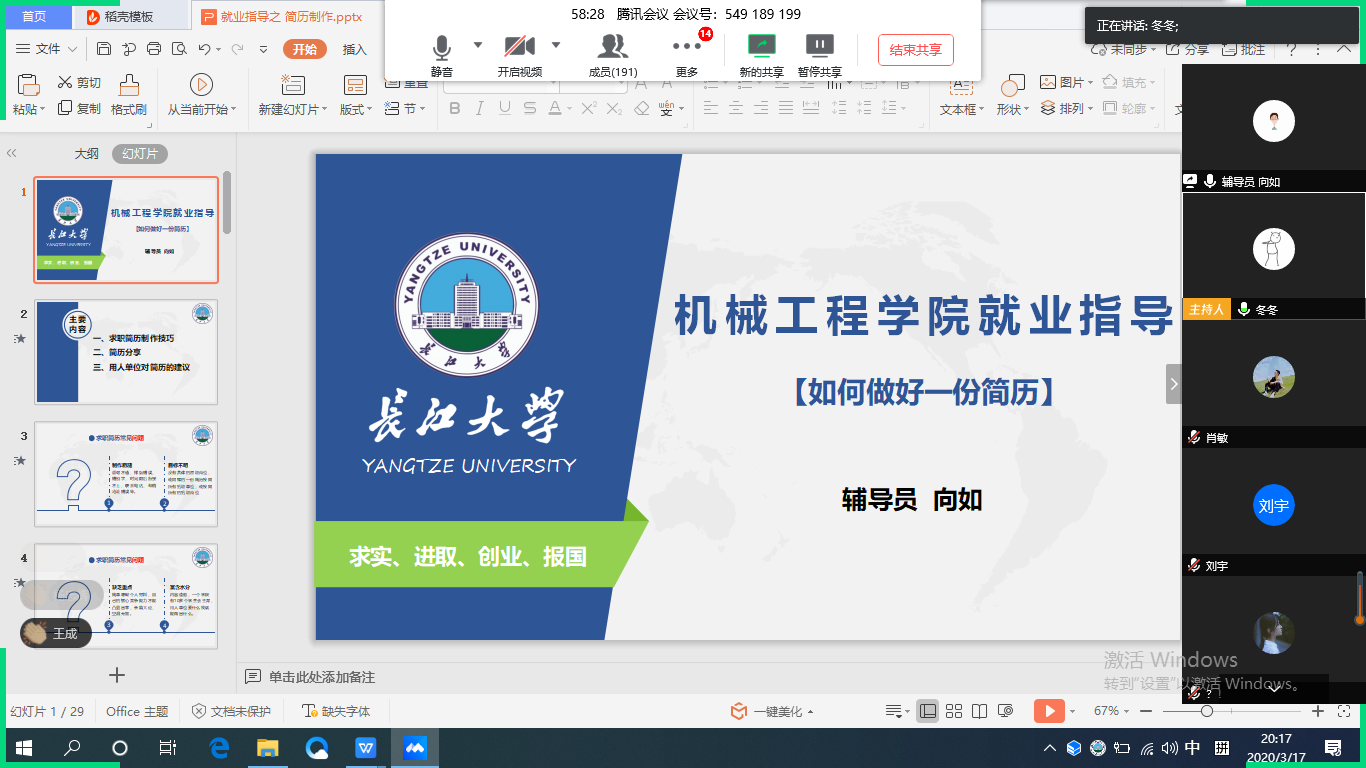 3月17日,Beats365唯一官网入口利用腾讯会议为200多名毕业生开展就业“云讲座”,提升员工简历制作能力和面试技巧,辅导员向如、刘冬冬组织此次活动。