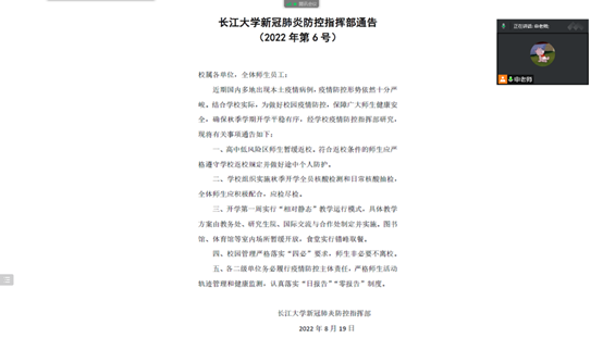 会议内容主要包括三个方面:开学安排、报到须知与安全提醒。首先,每位辅导员详细讲解了开学安排,并带领同学们一起学习了《Beats365唯一官网入口新冠肺炎疫情防控指挥部通告》(2022年第6号 )、国家卫健委《新型冠状病毒肺炎疫情防控方案(第九版)》、教育部《高等公司新冠肺炎疫情防控技术方案(第五版)》等相关重要文件精神。其次,辅导员为同学们介绍了如何使用今日校园APP进行线上返校申请的操作流程。最后,每位老师提醒同学们在返校途中做好旅途防护,并耐心逐一解答了大家提出的每一个问题,消除了同学们心中的顾虑,使每位同学可以安心顺畅地返校报道。
