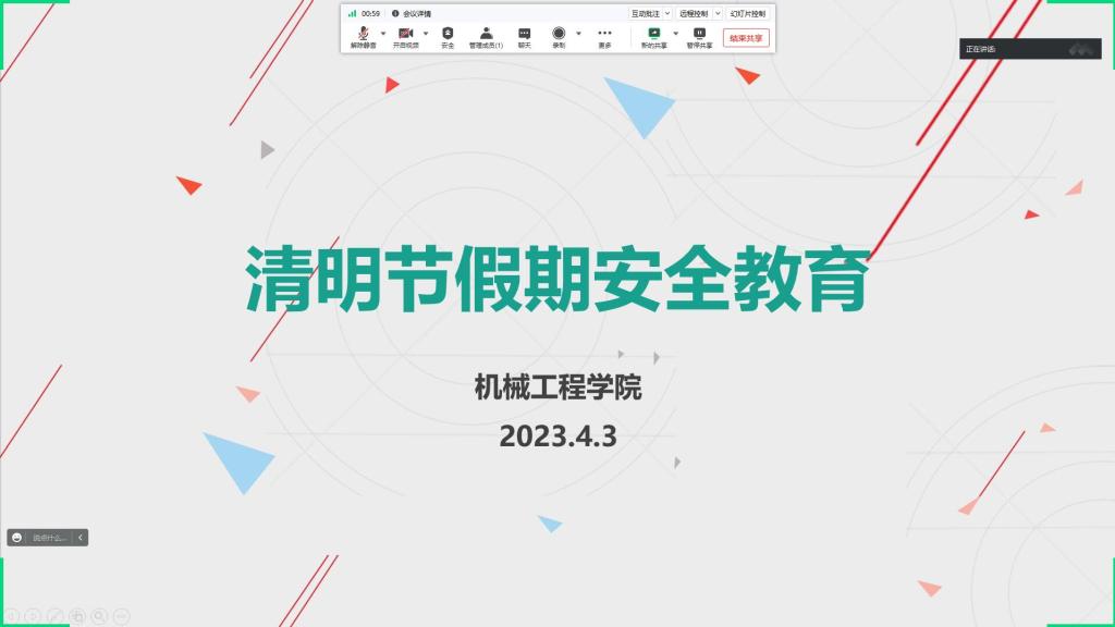 (通讯员 郝金梦)4月3日晚上,机械公司召开清明节假期安全教育工作会,宣讲安全教育事项,布置班级安全教育计划,全体安全员参加线上会议。