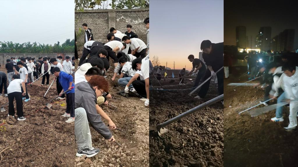 后续,大一同学在班长安排下分批劳动,分工碎土、开垄整地、播种,现场高效有序,绘就“劳动丰收图”。